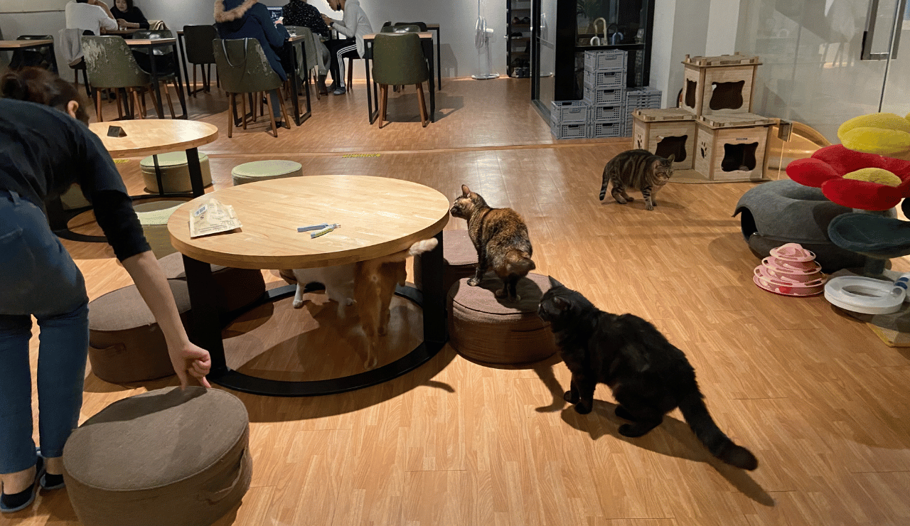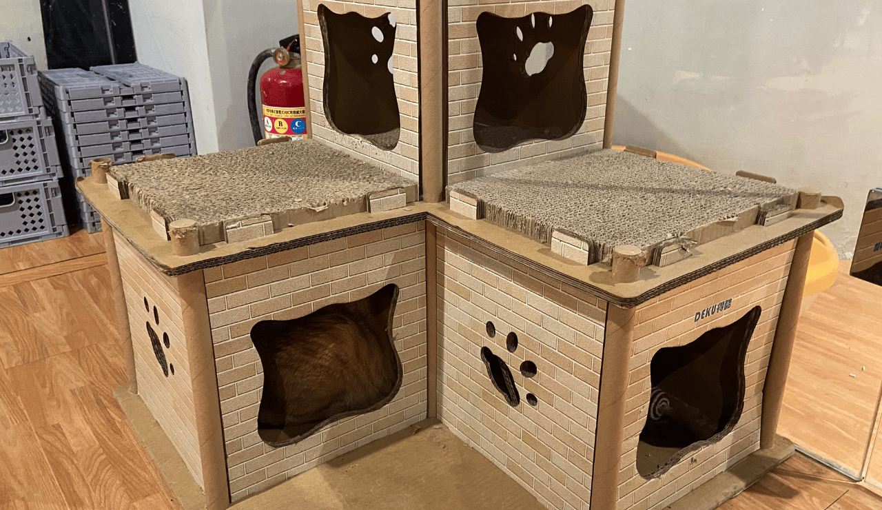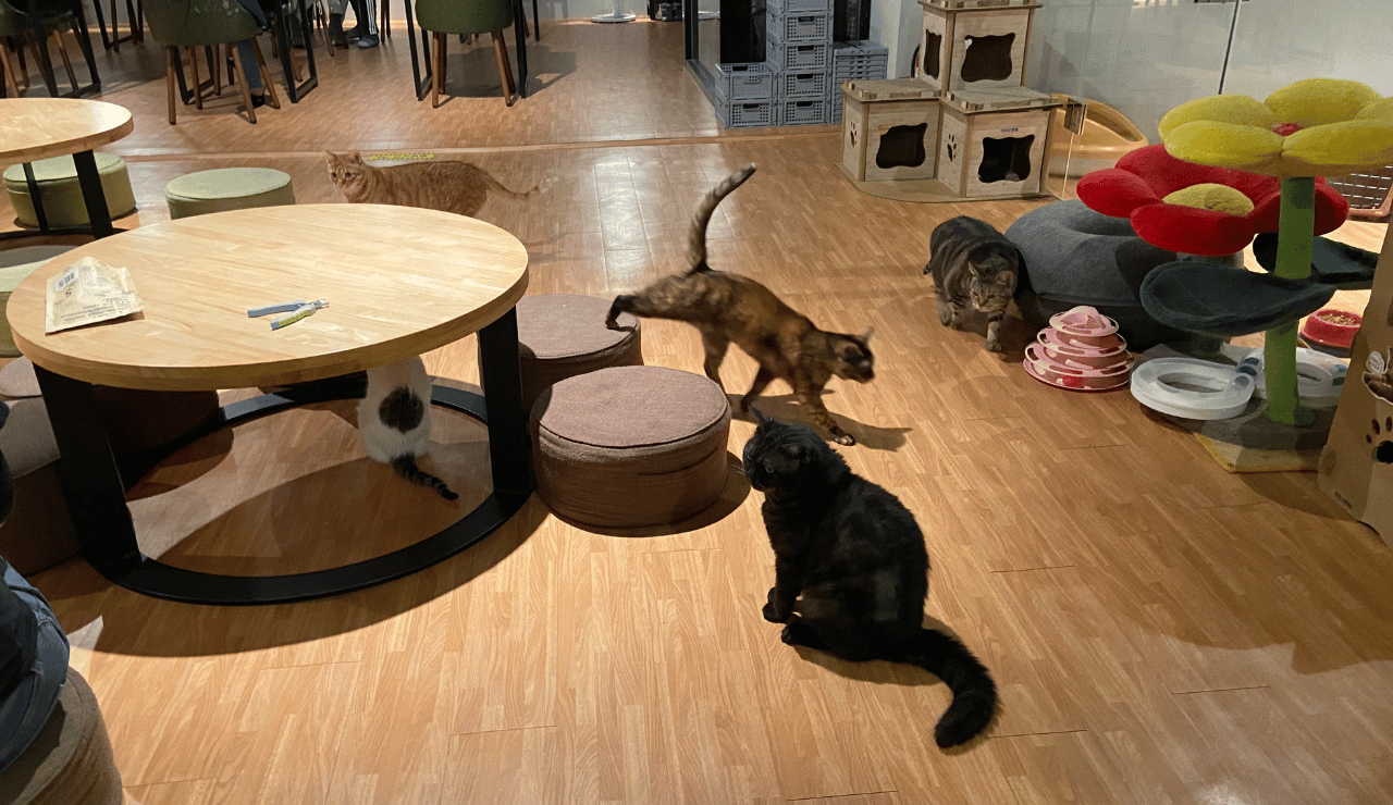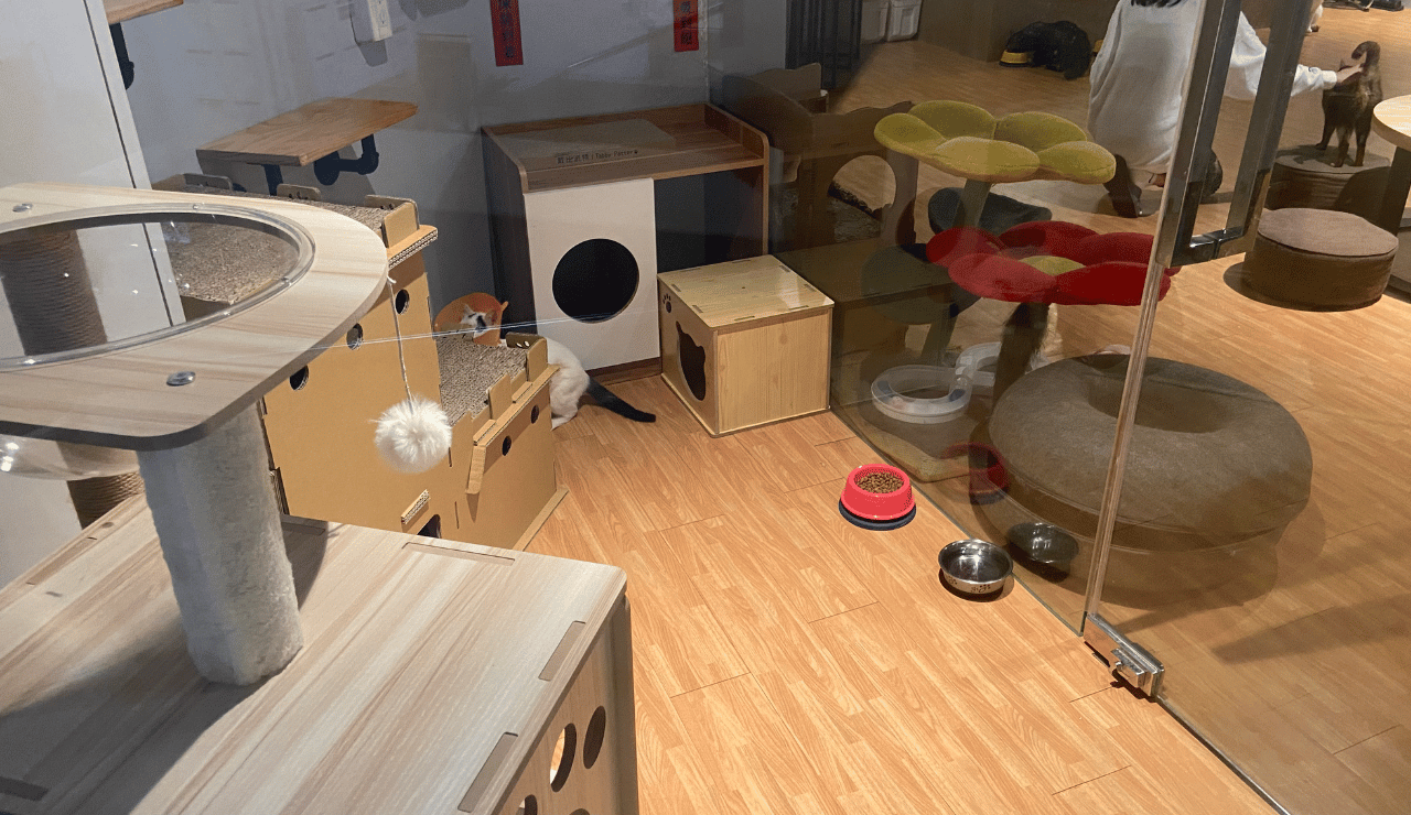 有別一般寵物咖啡廳桌子多、貓咪奔跑空間較少的情況,其實有一半以上的空間都是矮桌,且讓貓咪有"足夠"的空間可以賽車奔跑或追逐,貓跳台、貓抓板幾乎是無限量供應抓到飽、飼料裡面也永遠都有食物,讓人不禁好奇...也太幸福了吧!