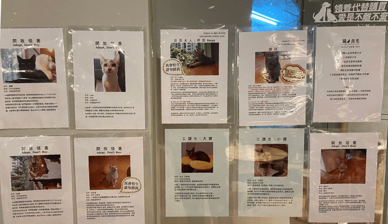 這間貓食光也是間可領養的中途之家,在入口處的左邊有一整排待領養的公告、還有個性與身份(?)等等,現場也都有貓貓們在四處亂串,對於有感情有連結的!!也可以趁這個機會收編回家喔!都可以好好和店家討論,收編也有一些基本條件,若感興趣的,還不快去!