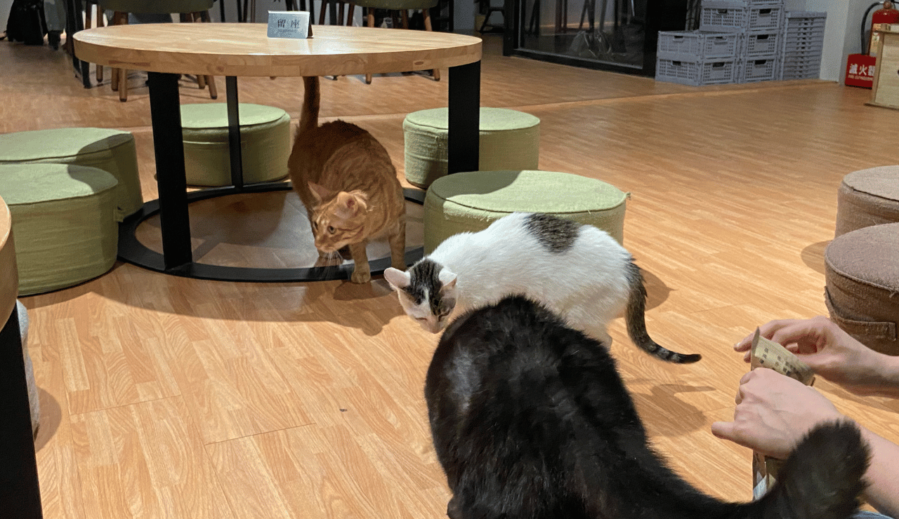 全天下貓咪共同的語言"零食"時間來囉!在貓食光很有趣的是每隔一段時間大哥大姐們就會來餵食或是帶著貓貓們一起玩耍,有的和客人玩到一半的貓貓頓時也衝過來了,再好的玩具也比不上食物的誘惑是吧?