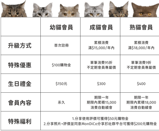 例1:熟貓會員一年內消費達$16,000未滿$18,000,則變年輕為成貓會員